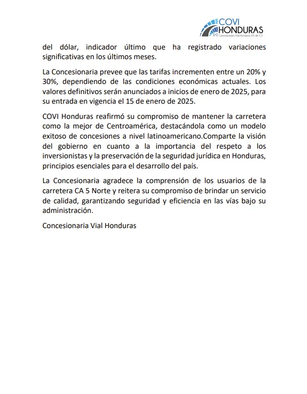 Por su parte, Covi Honduras reafirmó que el aumento es necesario para continuar con la operación y mantenimiento de la infraestructura vial, y que se realiza como parte de sus obligaciones contractuales.